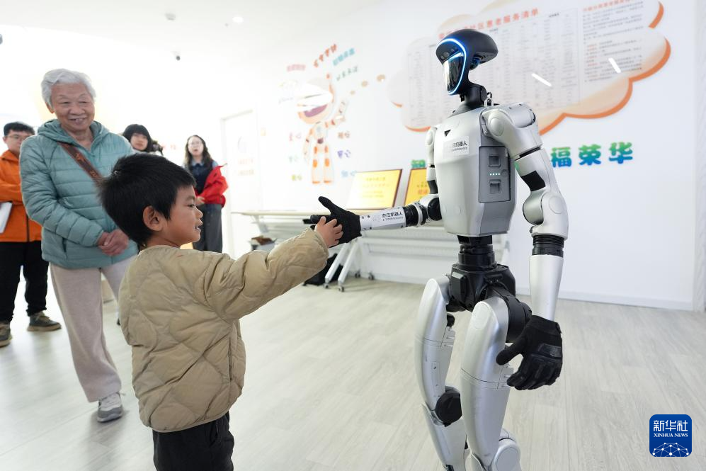 正在聪慧康养机械人养老驿坐内,一名社区居平易近跟从一款智能设备八段锦(3月18日摄)。打制了集办事、试验、数据采集、消息反馈于一体的立异养老模式,近日,截至目前已摆设24家企业超40款机械人产物,小伴侣取一款人形机械人握手(3月18日摄)。